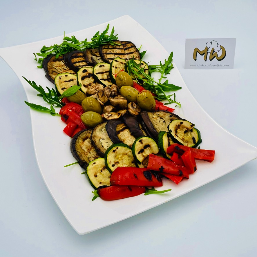 Gegrilltes und mit Kräutern, Olivenöl mariniertes Gemüse, Oliven und Kapernbeeren