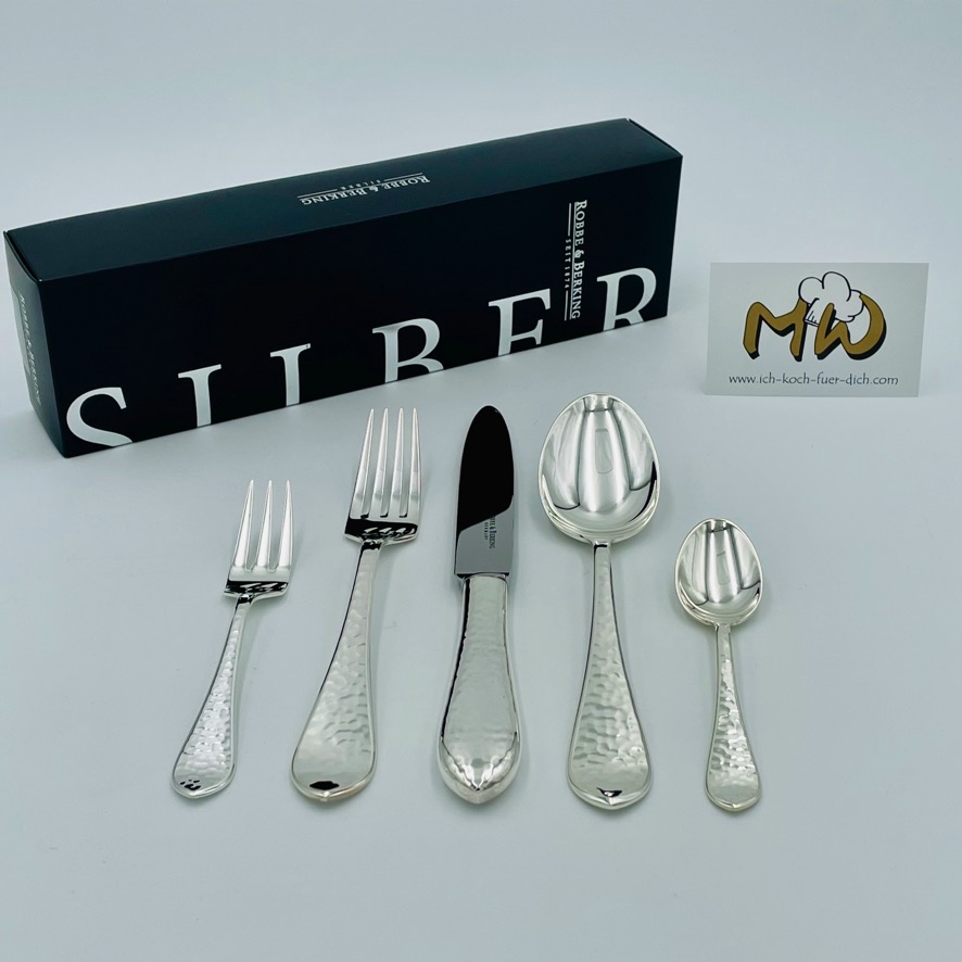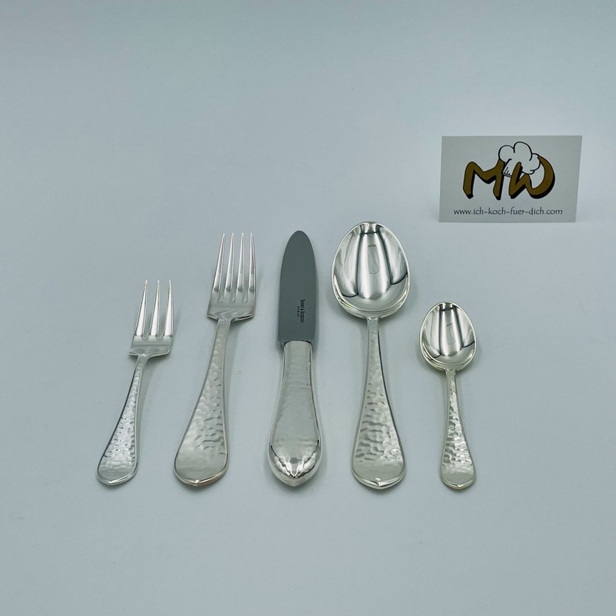 Garnitur bestehend aus 1 Gabel, 1 Messer, 1 Suppenlöffel, 1 Kaffeelöffel, 1 Kuchengabel