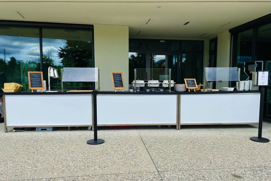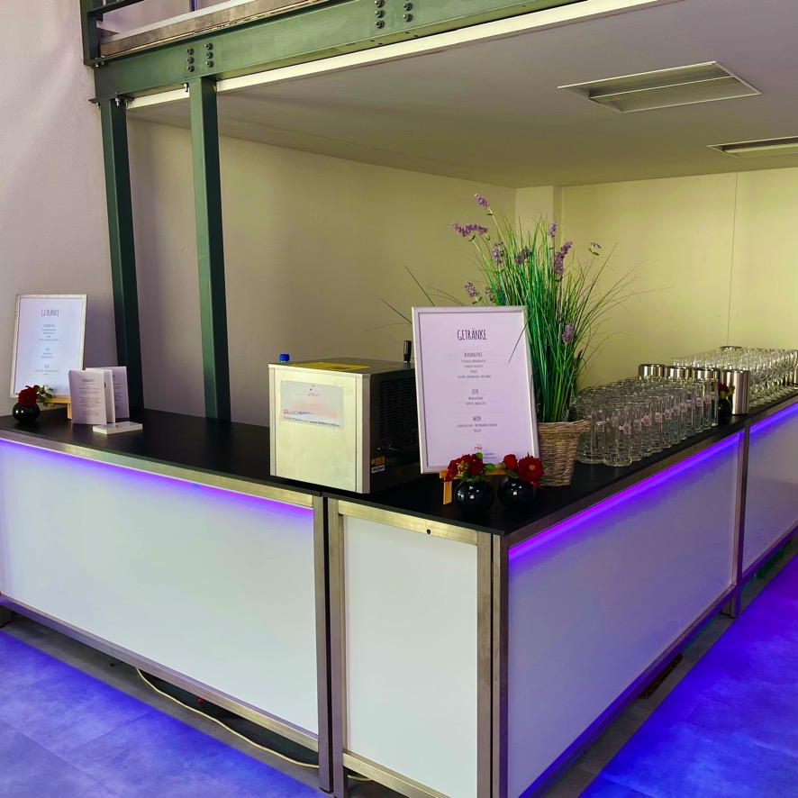 Edelstahl Theke, Arbeitsfläche Schwarz, Front weiß mit LED RGB