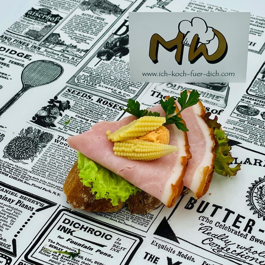 Vollkornbaguette mit Backofenschinken, Salat, Liptauer und Sauergemüse