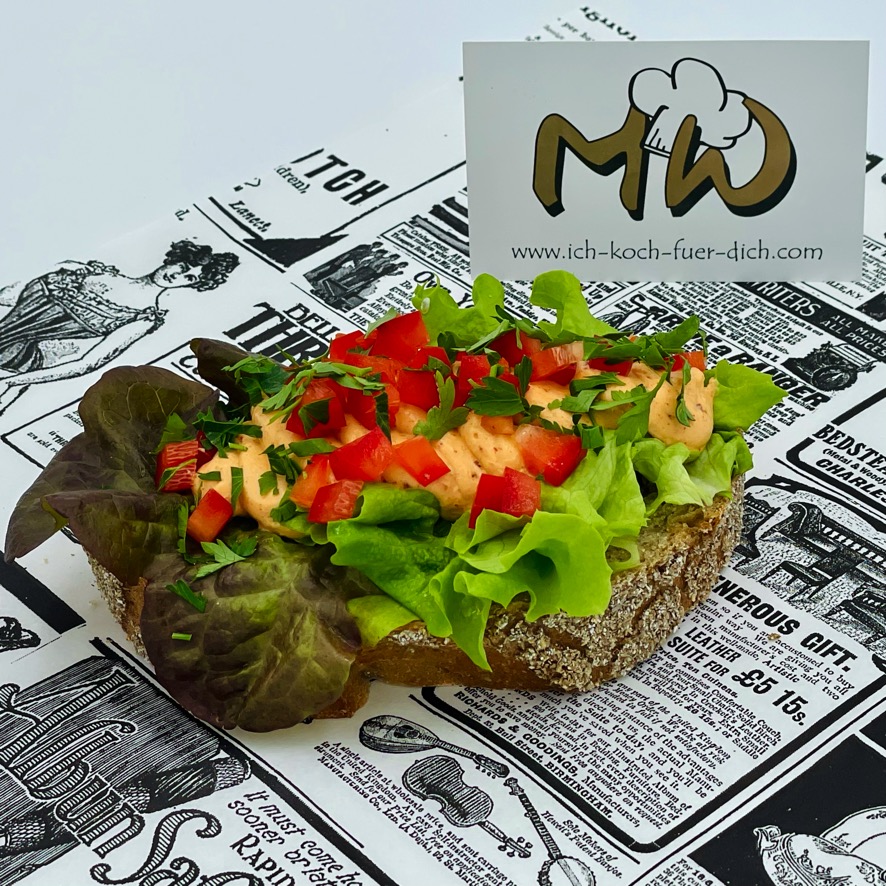 Surheimer Bauernbrotschnitte mit scharfen Liptauer, Salat und Paprika belegt