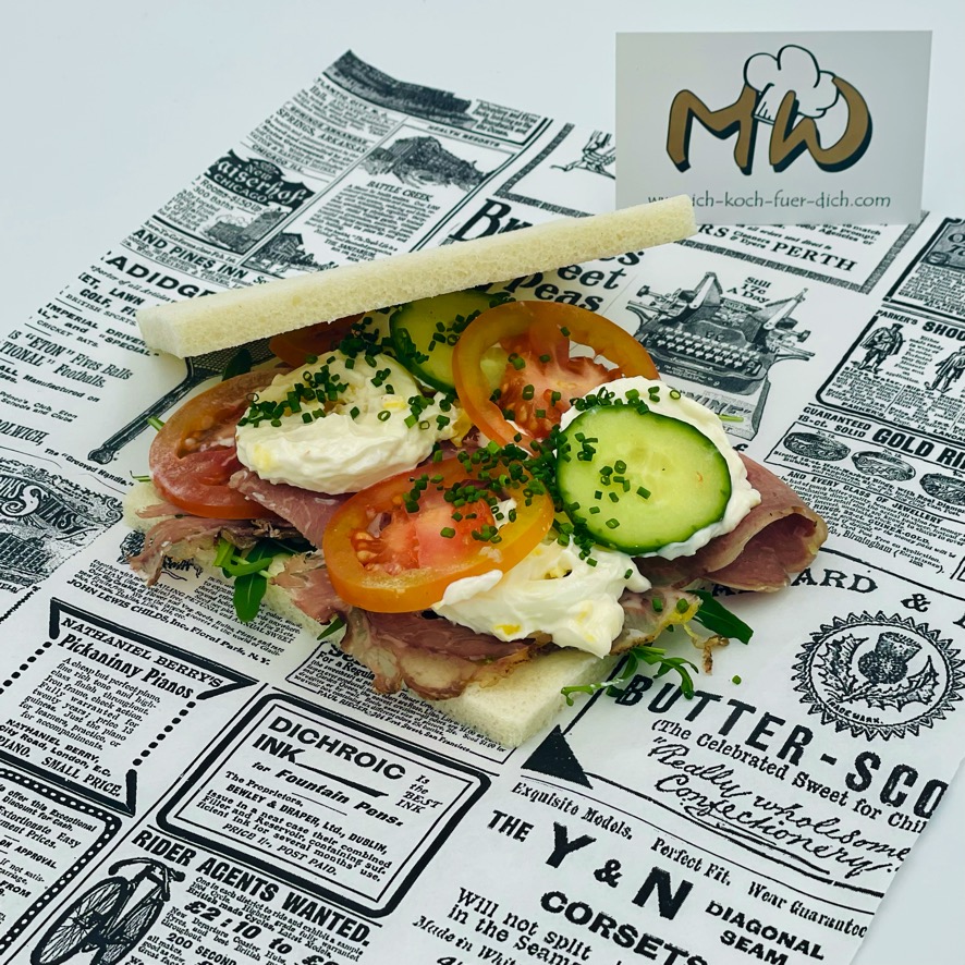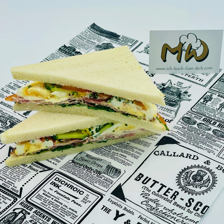 Tramezzini mit Roastbeef, Eiersalat, Rucola, Tomate und Gurke